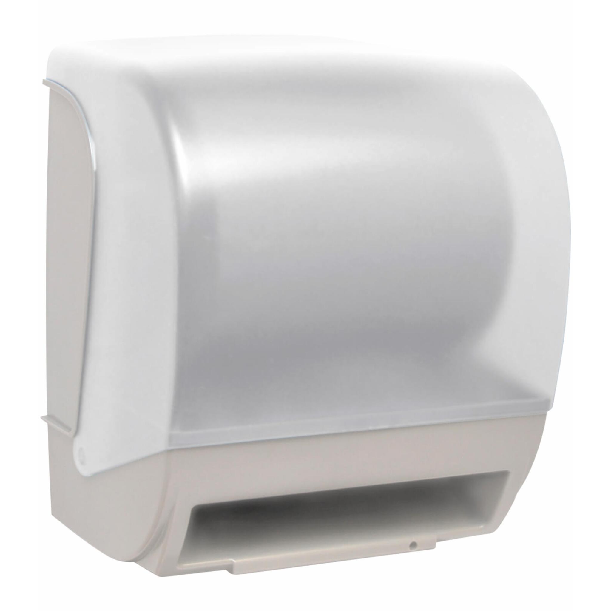 Automatic feed paper towel dispenser with manual cut. Battery operated. ABS white body with an elegant opaque cover that allows you to view content. Maximum roll size Ø200 x 220mm